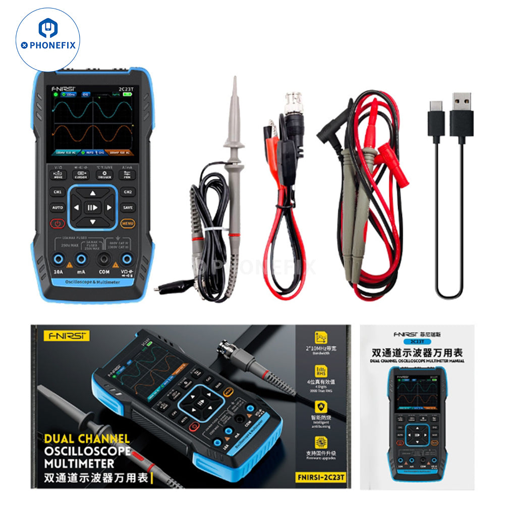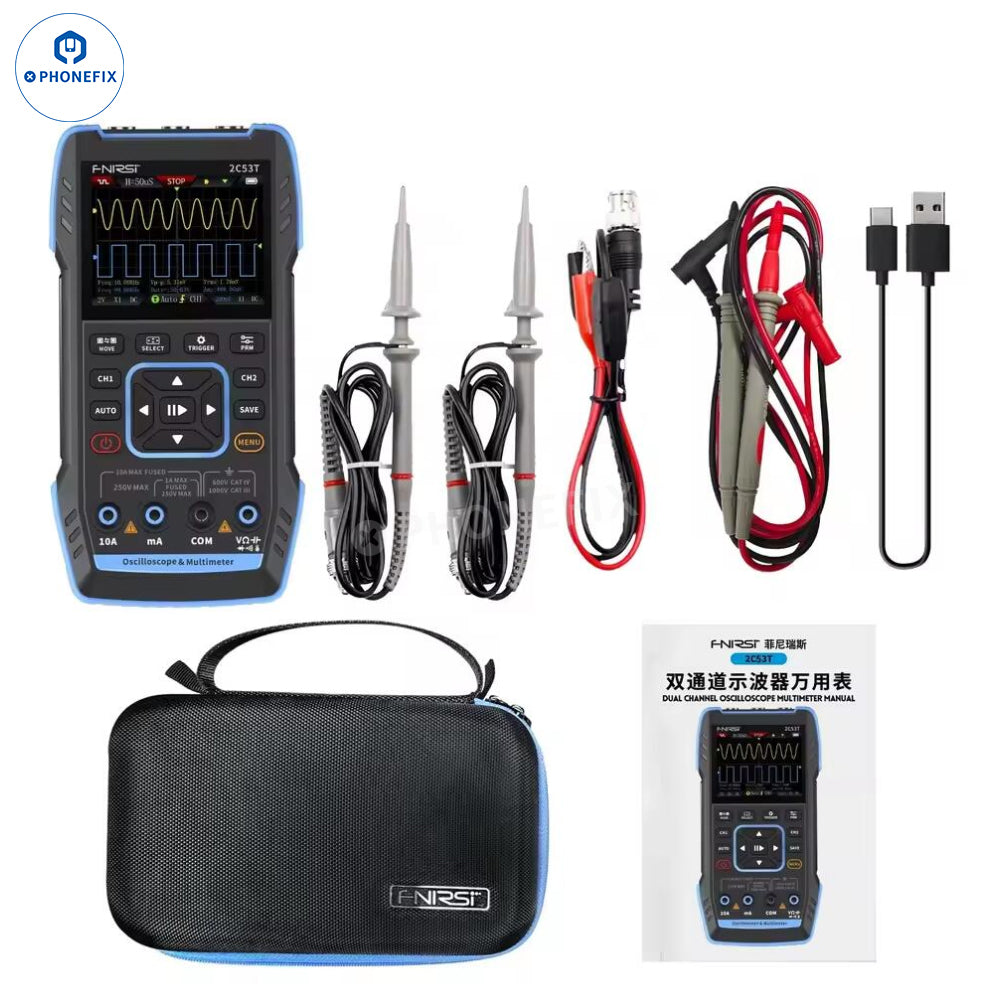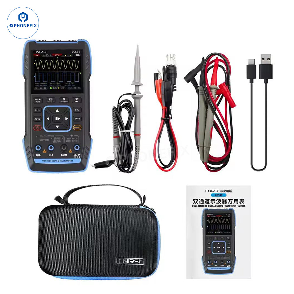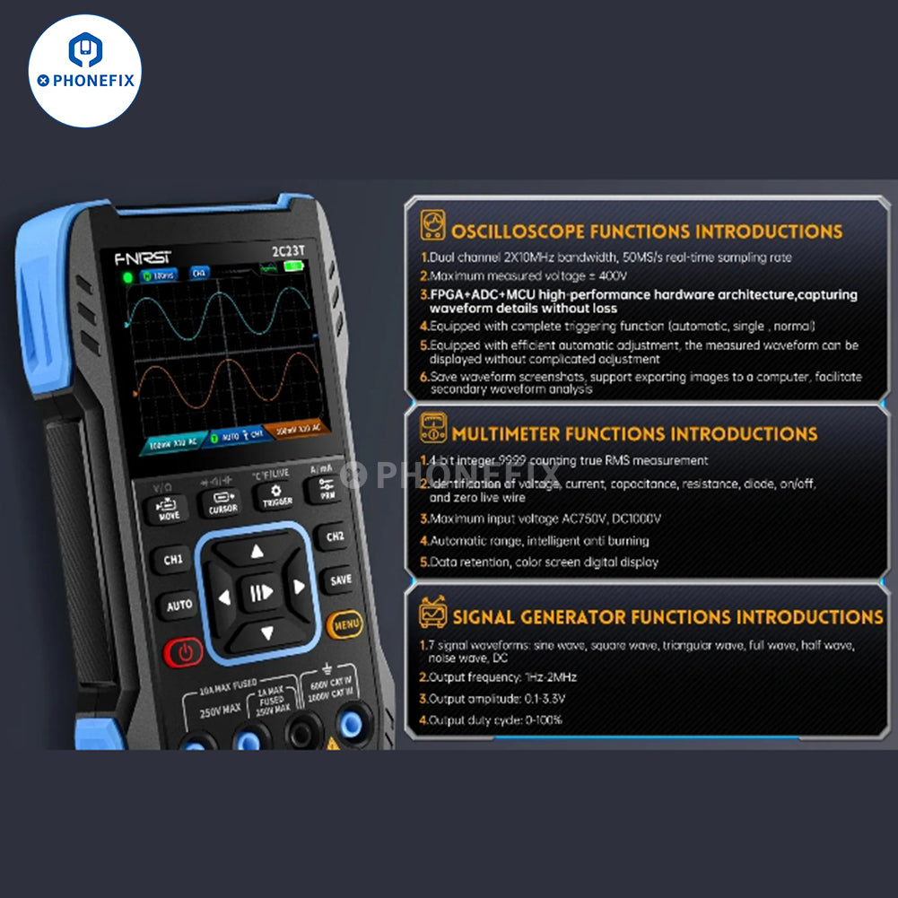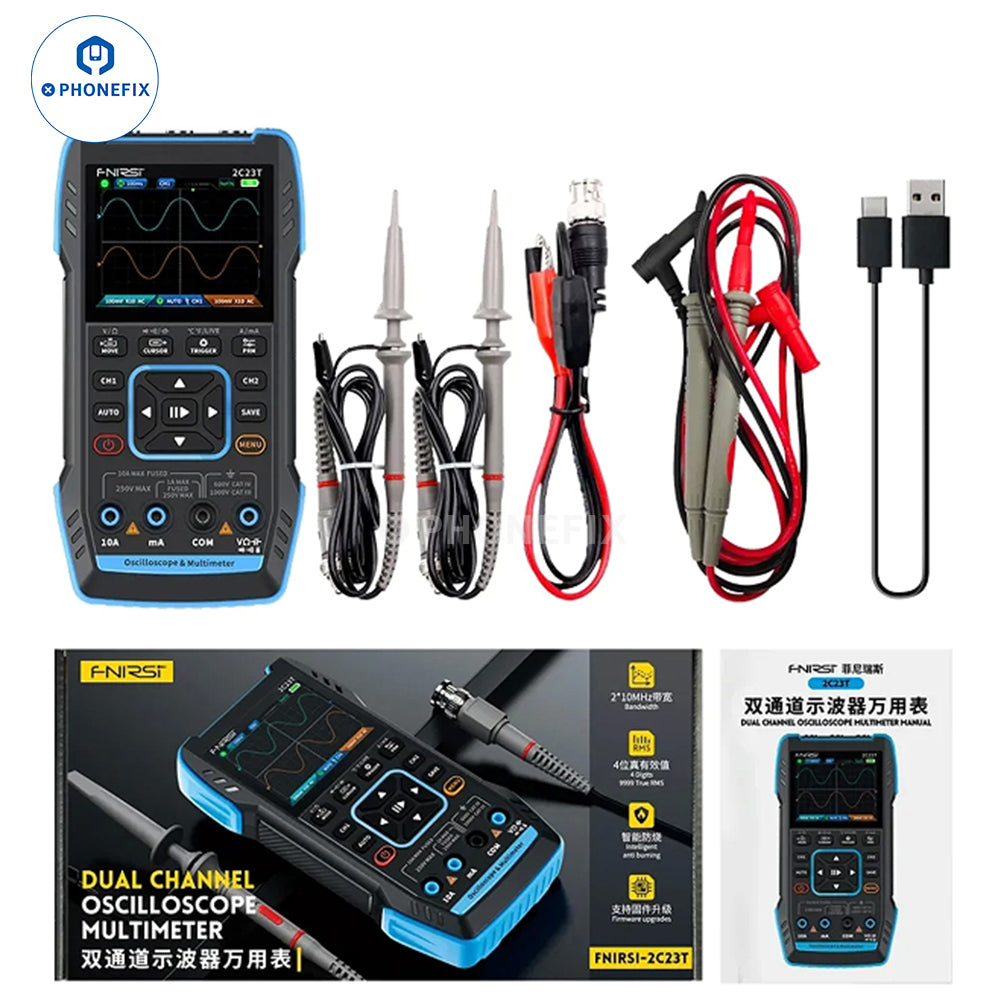 Osciloscopio digital 2 en 53 FNIRSI 2C23T 3C1T que integra las funciones de osciloscopio, multímetro y generador de señales. El generador de señales FNIRSI 2C53T 2C23T con pantalla de 2.8 pulgadas es un osciloscopio digital de doble canal, totalmente funcional y muy práctico, diseñado para las industrias de mantenimiento y desarrollo, lanzado por FNIRSI.