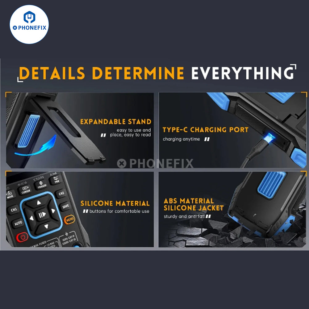 6. Excelente diseño: el osciloscopio adopta la arquitectura de hardware FPGA + MCU + ADC, módulo de protección de alto voltaje incorporado, pantalla LCD de 2.8 pulgadas, batería de iones de litio incorporada de 3000 mAh, tiempo de espera de hasta 6 horas, la interfaz Tipo-C admite carga de 5 V/1 A.