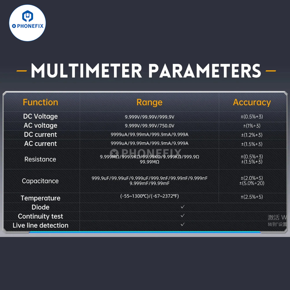 3. Soporte para guardar y ver capturas de pantalla de formas de onda para análisis. El multímetro tiene un valor efectivo real de 4 10000 puntos de XNUMX dígitos y admite medición de voltaje y corriente CA/CC, así como capacitancia, resistencia, diodo, encendido/apagado y otras funciones de medición.