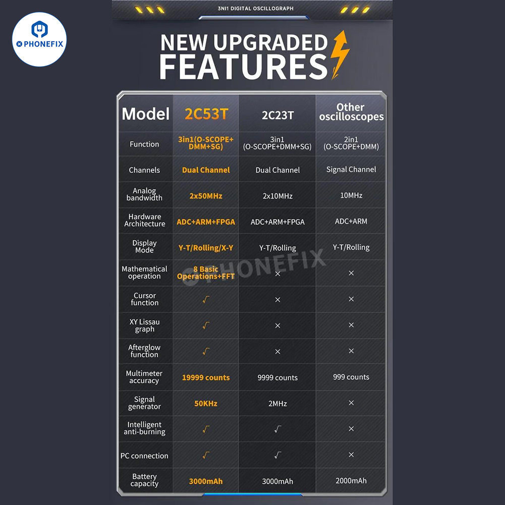 1. FNIRSI 2C53T es una versión mejorada del 2C23T, con un rango de medición mejorado y funciones agregadas como operación matemática, medición del cursor, modo de persistencia y modo XY.